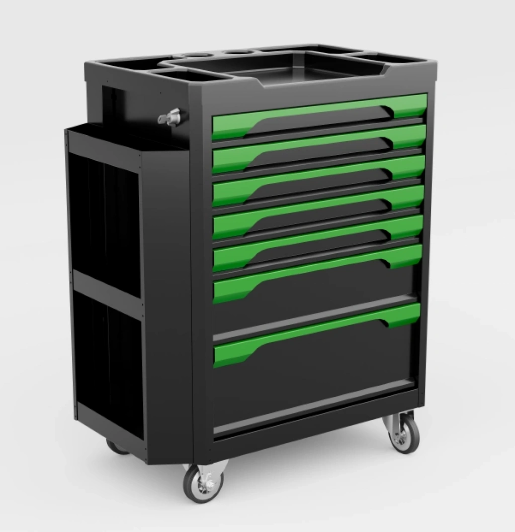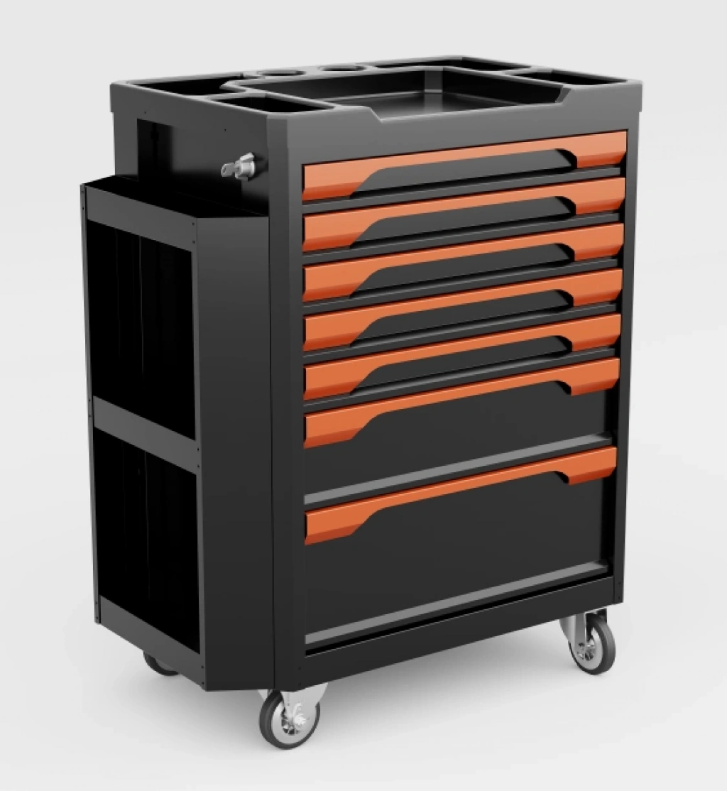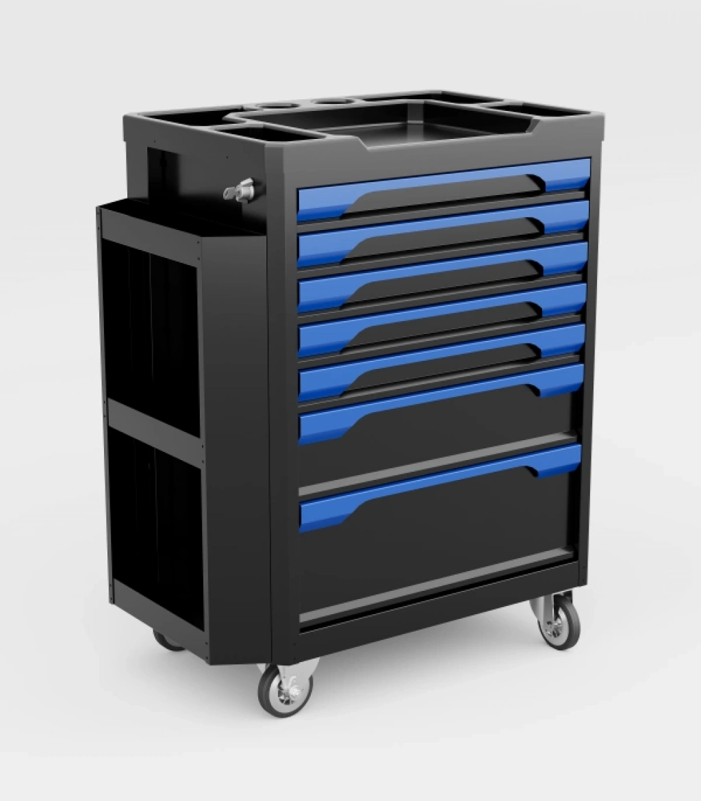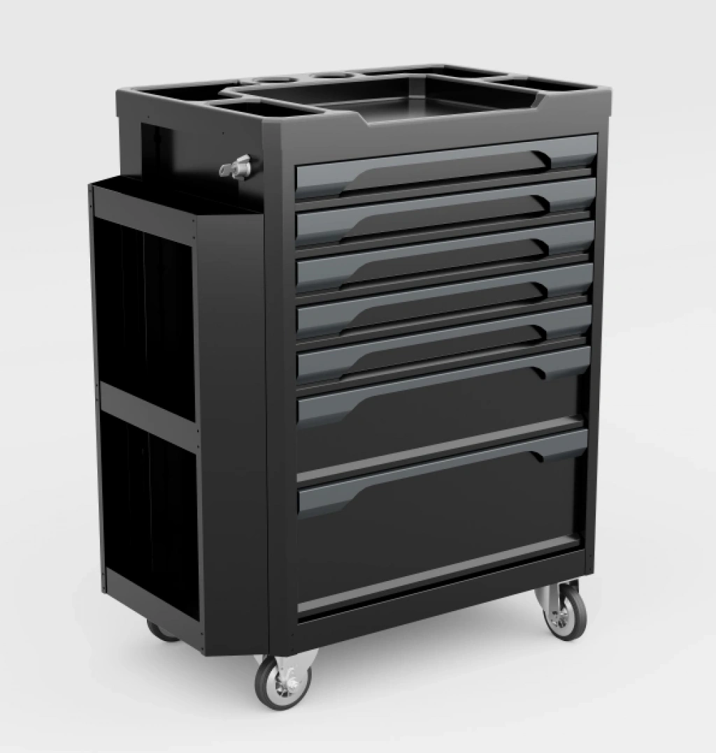 7 çekmeceli yanlıklı takım arabası, yoğun atölye ve servis ortamlarında düzenli, pratik ve güvenli çalışma sağlamak üzere tasarlanmıştır. Yan aksesuar alanları sayesinde el aletleri ve sarf malzemeleri kolay erişilebilir şekilde konumlandırılabilir.
