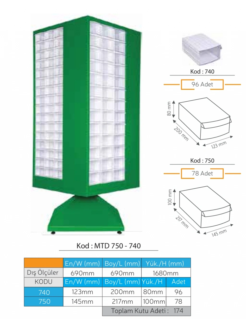 4 yüzlü döner metal dolap. Toplam 174 adet kapaklı kutu kapasitesi vardır.